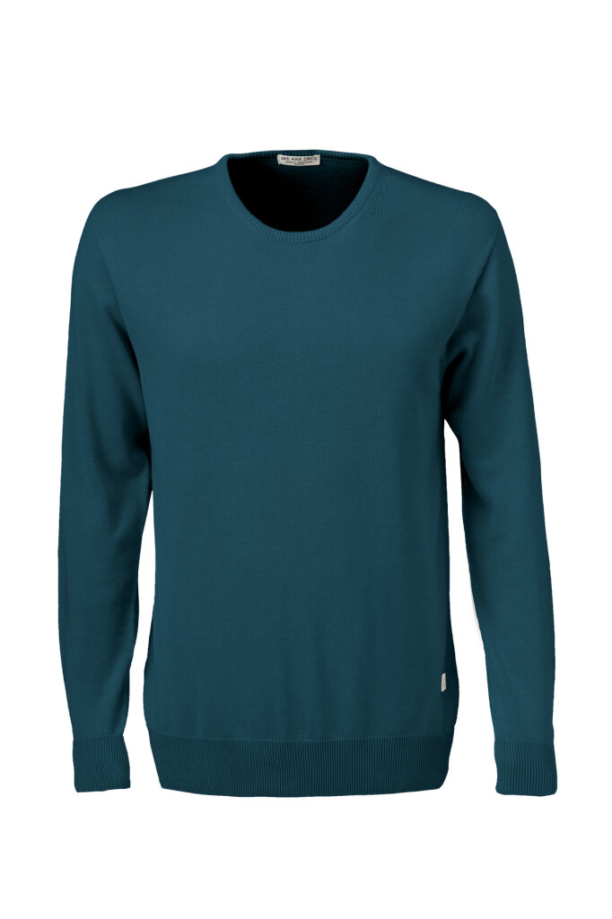 Die Passform des nahtlosen Strickpullovers ist normal und gerade geschnitten. Er hat einen Rundhalsausschnitt, leicht überschnittene Schultern und am Saum sowie an den Ärmeln ein feines Bündchen.