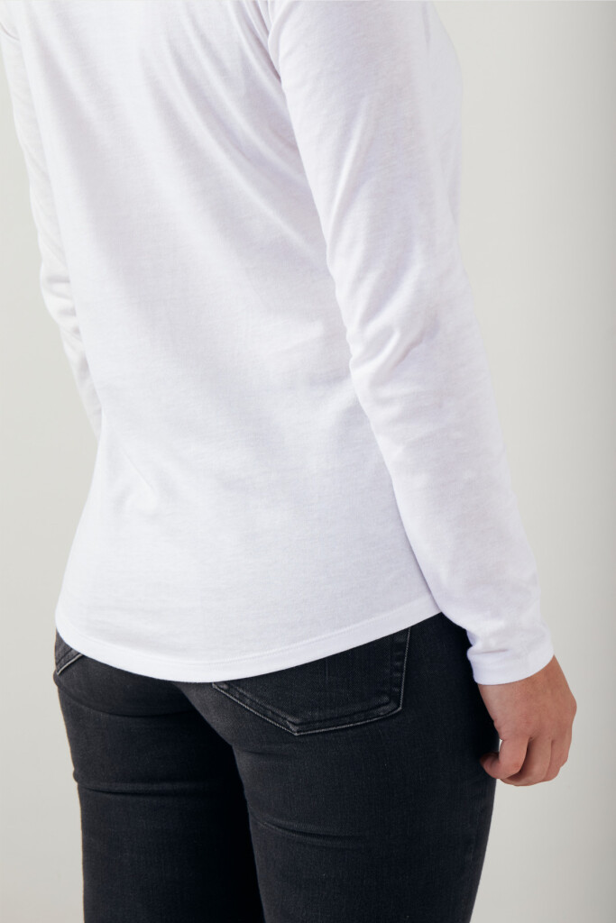 Die Passform des Longsleeve ist leicht tailliert und hat eine längere Rückenpartie sowie einen Rundhalsausschnitt.