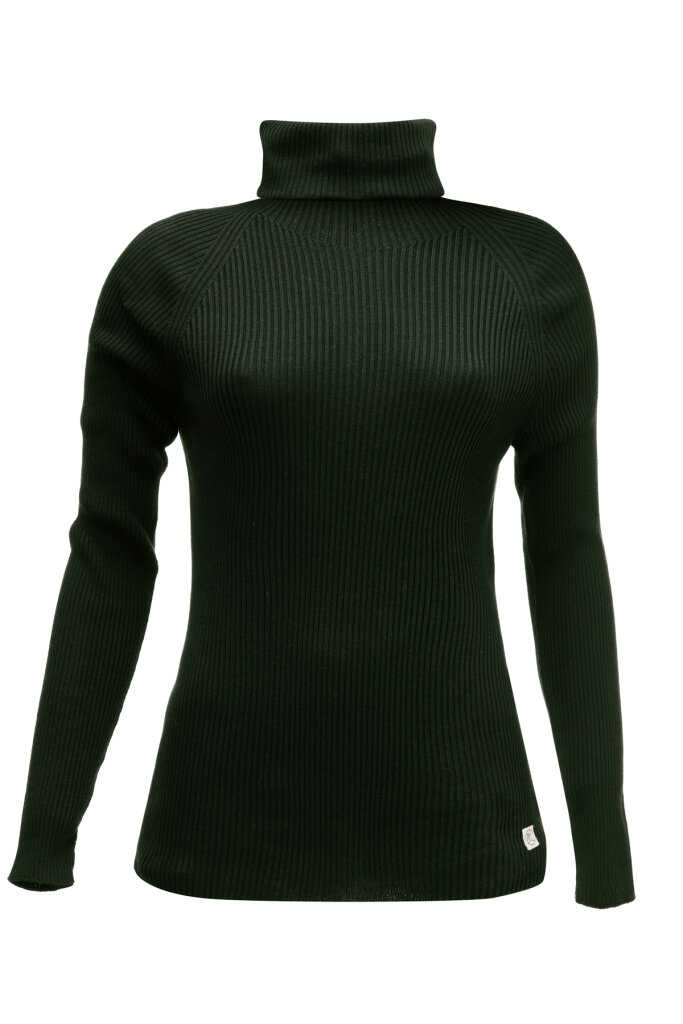 Die Passform des nahtlosen Strickpullovers ist figurbetont und in einem klassischen Design gehalten. Zudem hat er einen hohen Rollkragen, welcher beliebig umgeschlagen werden kann und Raglanärmel.