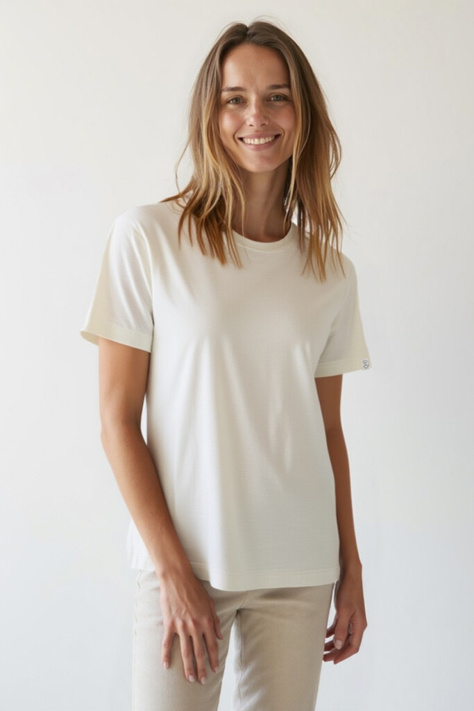 Das T-Shirt hat eine klassische, gerade Passform mit einem runden Halsausschnitt, der mit einem Bündchen aus Eigenmaterial ohne Elastan versehen ist und kurzen Ärmeln. Ein zeitloser Schnitt, der Komfort und Stil perfekt vereint.