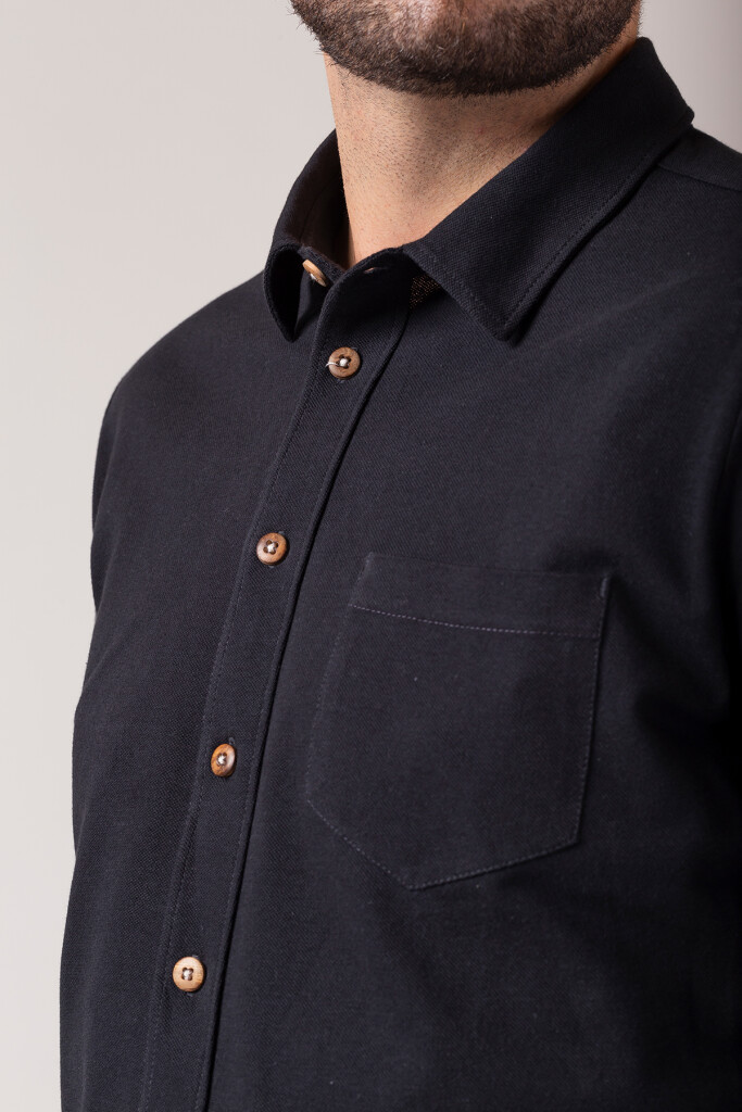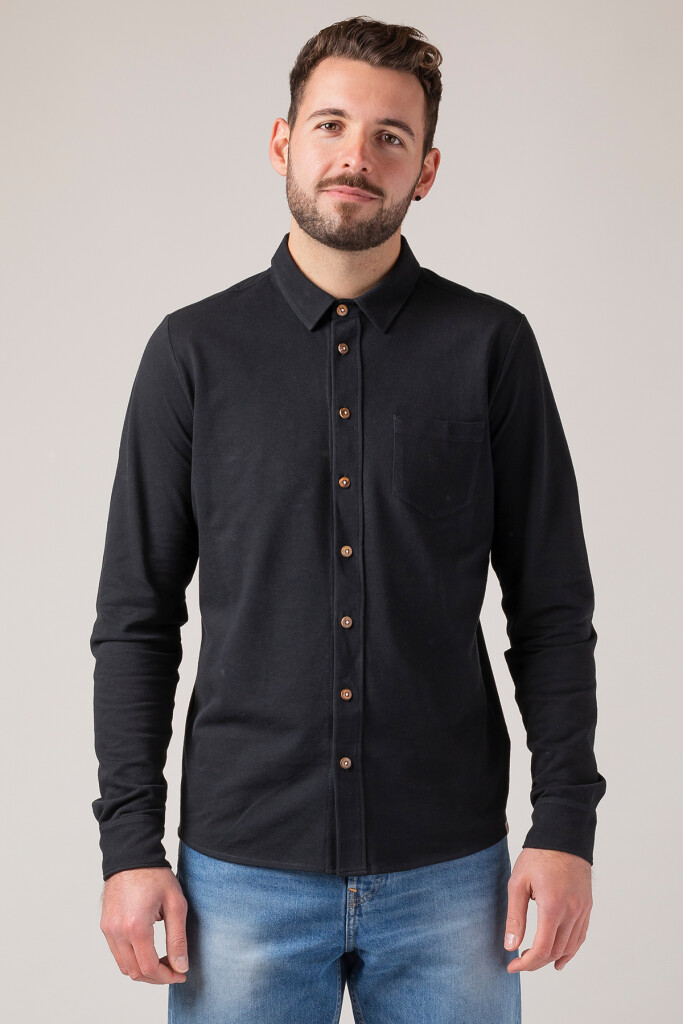 Das Hemd mit langen Ärmeln hat einen normalen Hemdschnitt. Zudem ist es klassisch verarbeitet, mit Manschetten, Schulterpasse, Hemdkragen und abgesteppter Knopfleiste mit Olivenholzknöpfen.