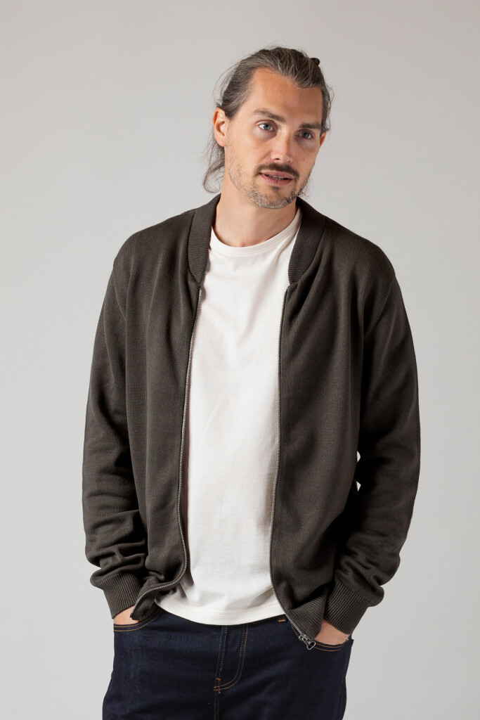 Strickjacke mit Reissverschluss für Herren, aus 100% Bio-Baumwolle und in der Schweiz produziert.